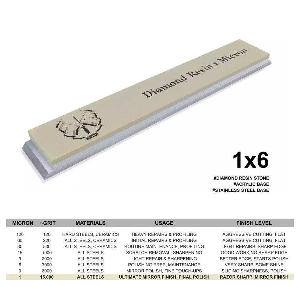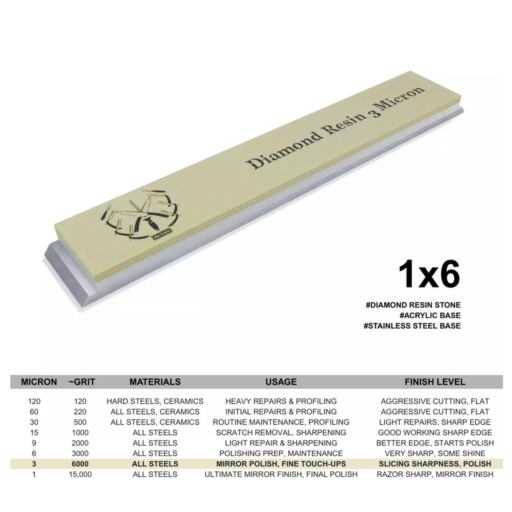 The #6 Micron Diamond Stone is equivalent to a 3000 grit stone and creates a slicing edge that is acceptable for almost any knife or tool. It prepares the edge for further refinement and mirror finishes. It is recommended to use this stone with the 15, 9, and 3 micron Jende Diamond Resin stones.
