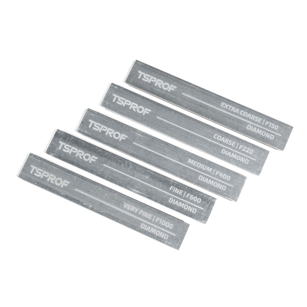 The TSPROF 5 Piece Diamond Plate Set is an excellent tool for repairing and refining a knife's bevel. This set includes diamond plates on blanks with different grit sizes, offering versatility for various sharpening tasks.