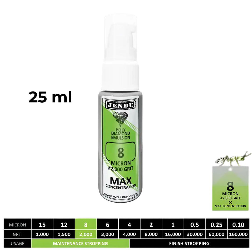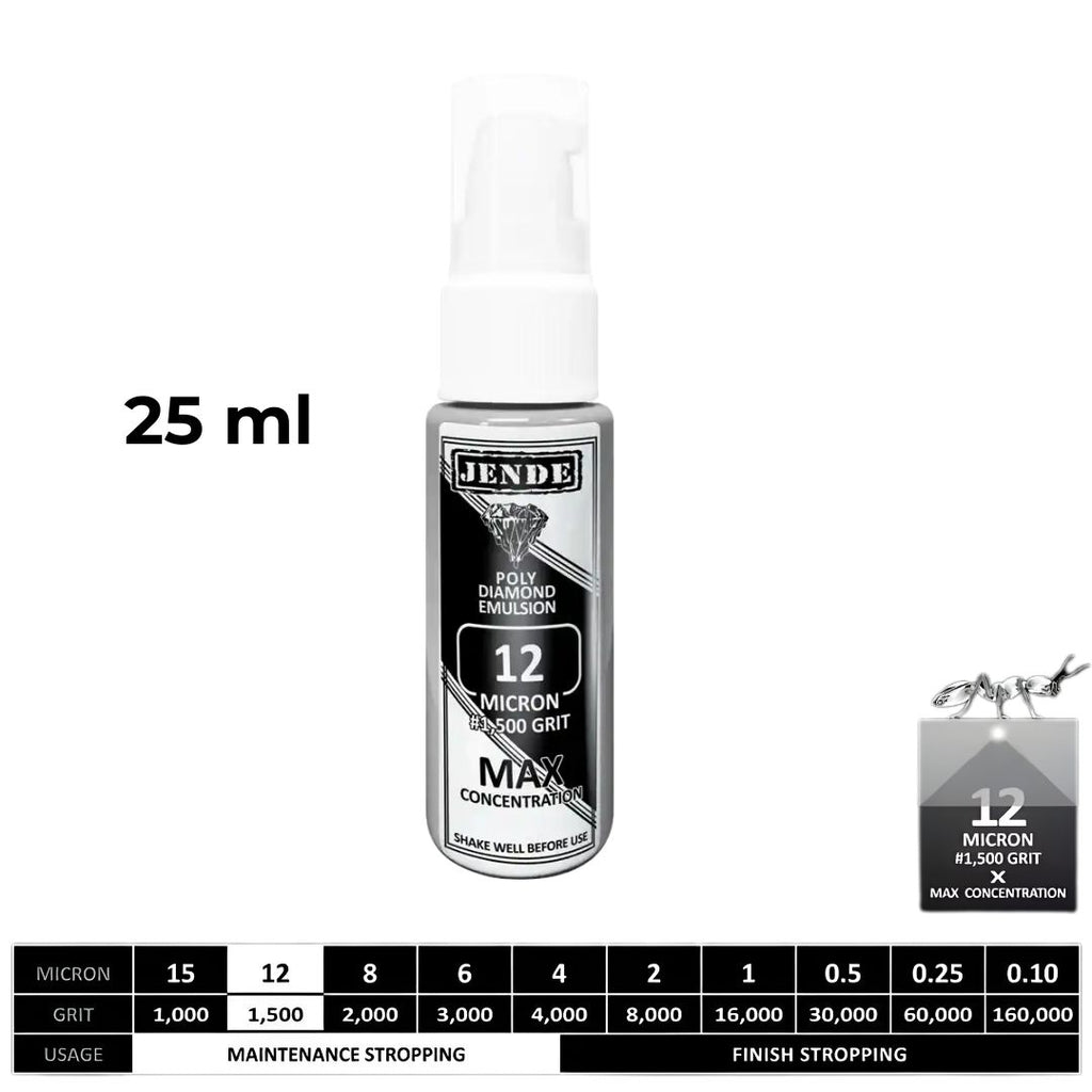 Get exceptional stropping power with the Jende Max Concentration Poly Diamond Emulsion, engineered for professionals who demand the ultimate edge. This high-performance diamond emulsion contains the maximum diamond concentration possible while maintaining a smooth liquid consistency, giving you faster cutting action than standard stropping emulsions.